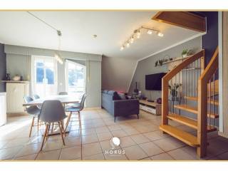 Die Wohnung setzt sich wie folgt zusammen: - Eine Eingangshalle - Ein Wohnzimmer (+/-28m²) mit Zugang zum Südbalkon - Eine separate ausgestattete Küche (+/-8m²) mit Zugang zum Nordbalkon - Ein Schlafzimmer (+/-11m²) - Ein Duschbad - Ein ausgebauter Dachboden/Büro (+/-17m²) - Eine separate Toilette