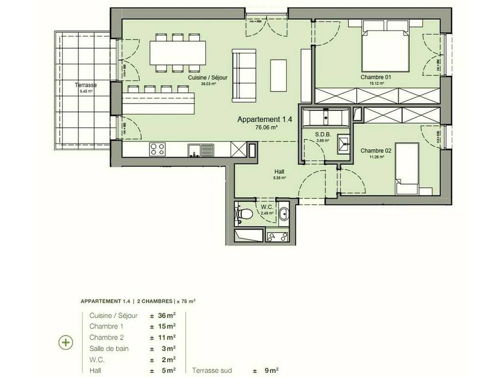 Die Wohnung im 1. Stock besteht aus einer angenehmen Eingangshalle mit Garderobenbereich, einem hellen, lichtdurchfluteten Wohnbereich, von der zum Wohnzimmer hin offenen Küche gelangen Sie direkt auf die 9 m2 große Terrasse. 2 Schlafzimmer und ein privates Badezimmer sowie ein separates WC vervollständigen die Immobilie.