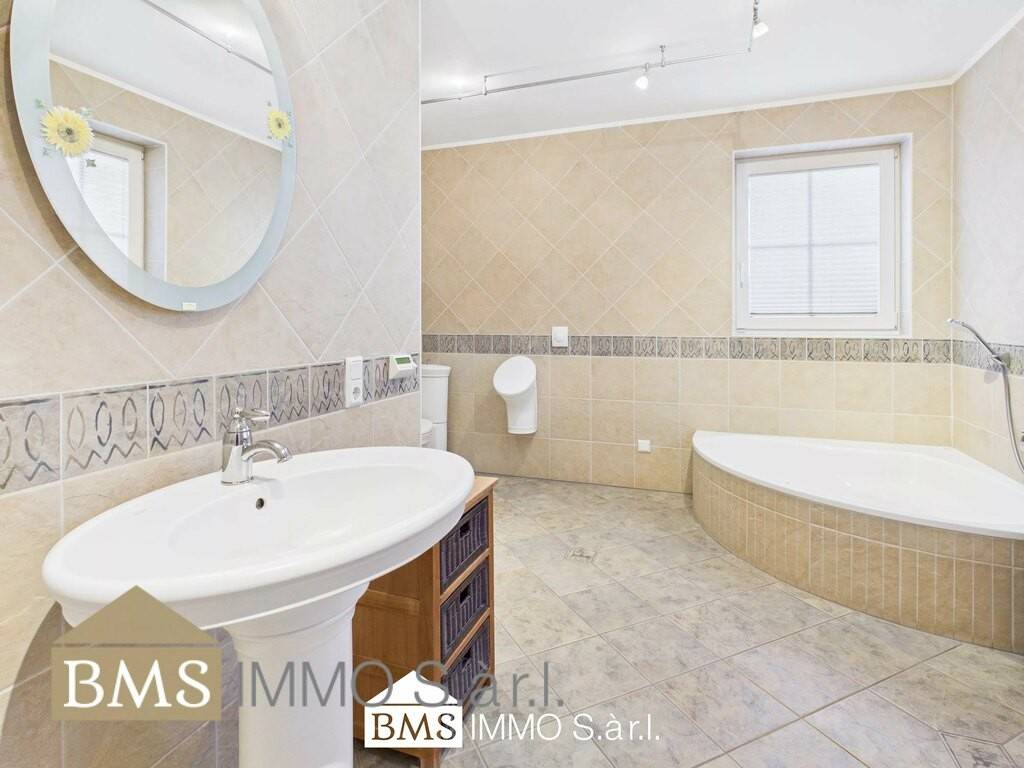 Das Badezimmer ist mit einer luxuriösen Badewanne ausgestattet, die zum Entspannen einlädt. Praktische Fensterläden sorgen für Privatsphäre und Schatten, während die Außenbeleuchtung das Haus optimal in Szene setzt. Die gepflegte Gartenanlage rundet das Angebot ab und bietet eine hübsche Aussicht.