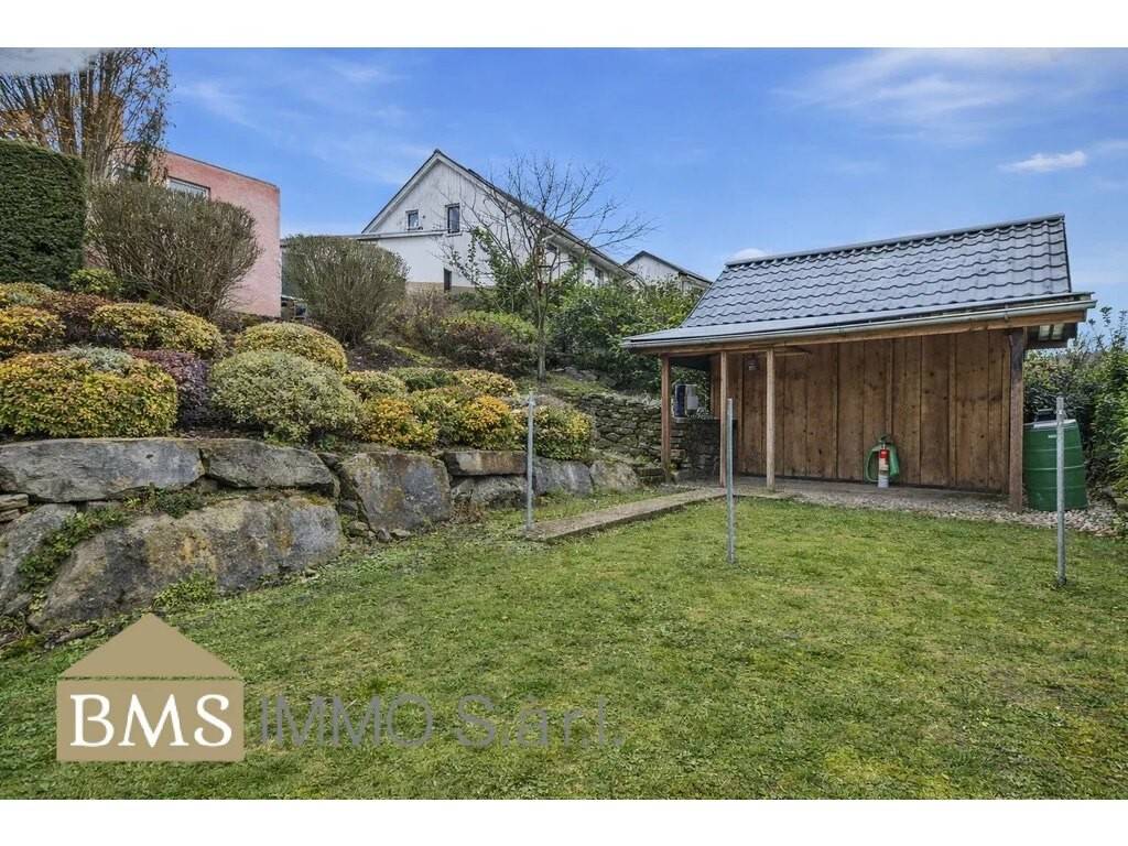- Geräte- Gartenhaus aus Holz auf der unteren Ebene des Gartens