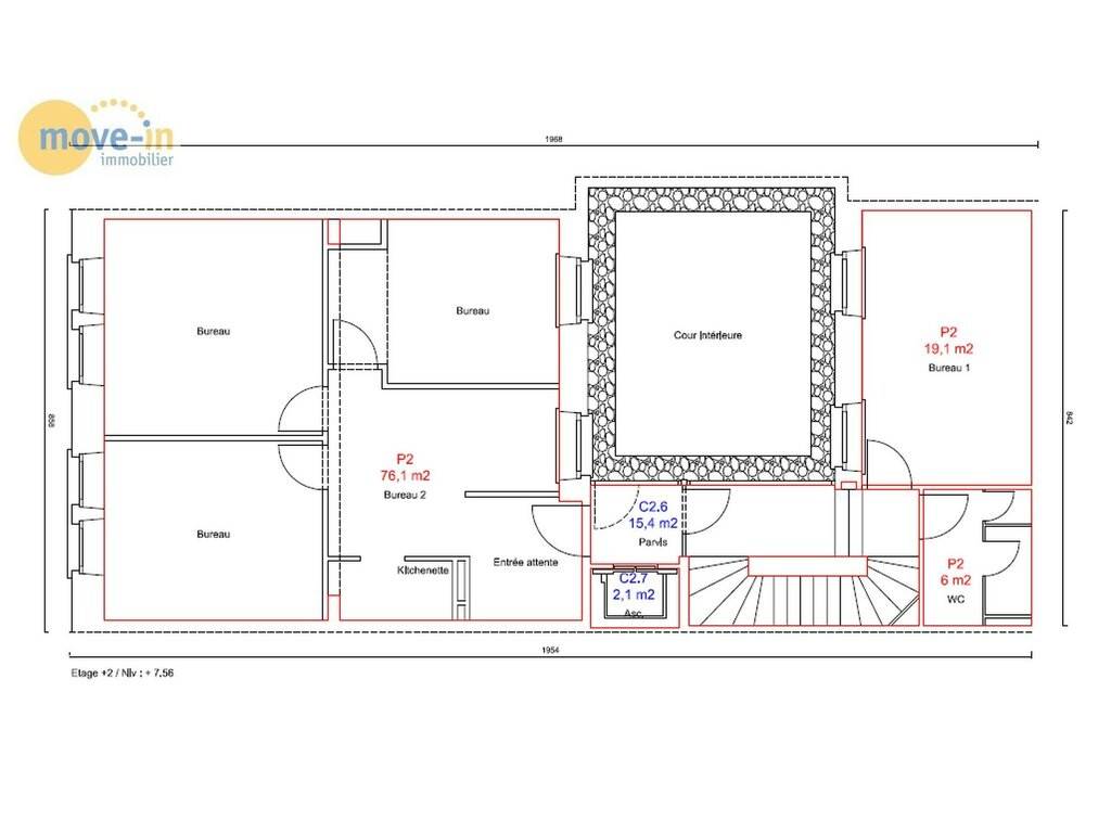 Hall d'entrée avec salle d'attente/secrétariat, kitchenette séparée, 3 bureaux et à l'entresol, un WC séparé et une salle de réunion de 19m2.