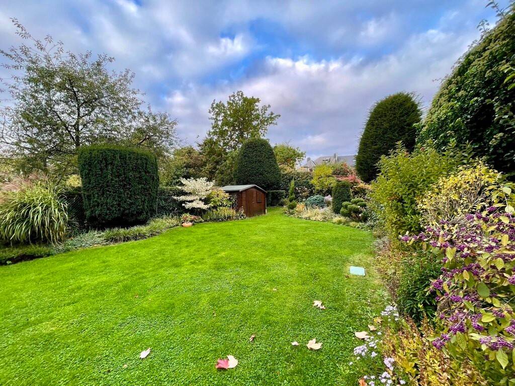 Splendide jardin paysager exposé sud-ouest avec maison de jardin au fond.