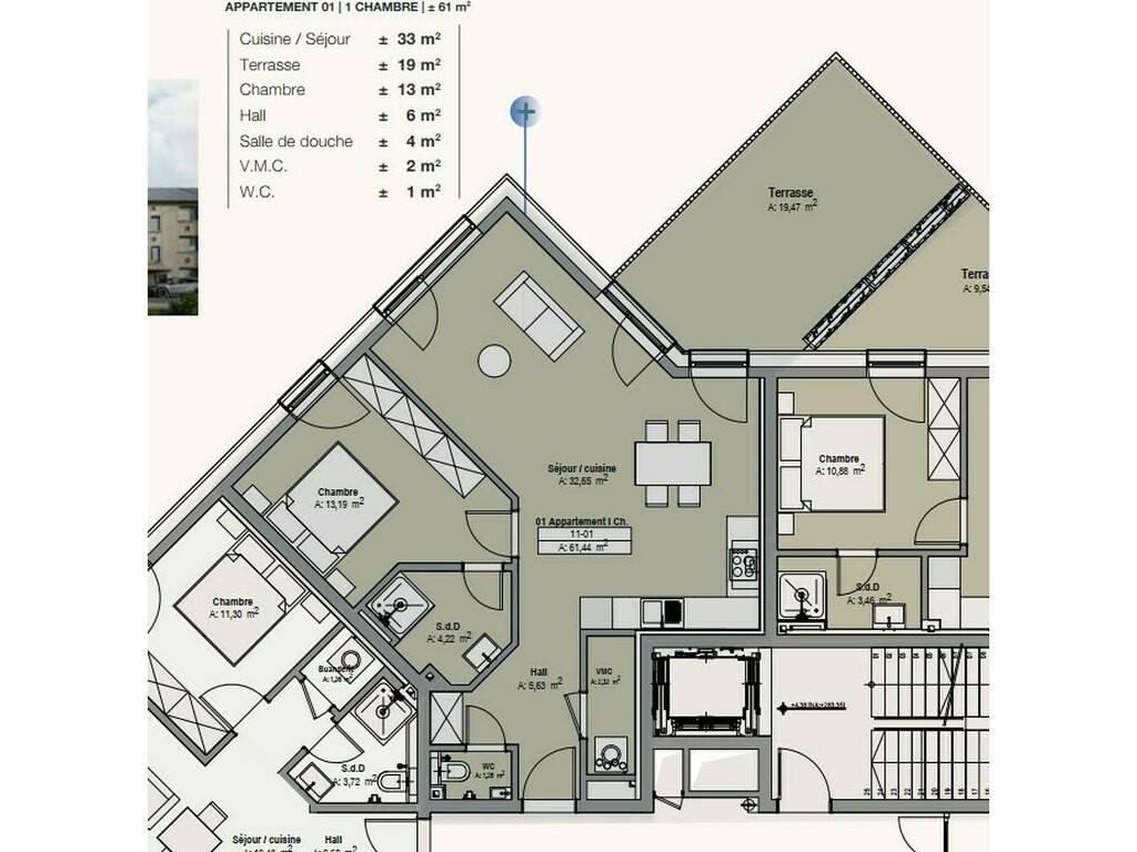 Das Apartment A.01.1 besteht aus einer Eingangshalle mit Garderobenbereich, einer offenen Küche mit Zugang zum Wohnzimmer und einer wunderschönen Terrasse von über 19m2, einem Schlafzimmer und einem Duschbad.
