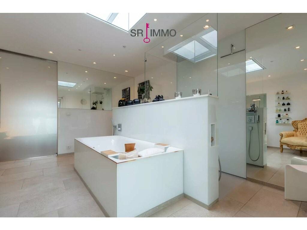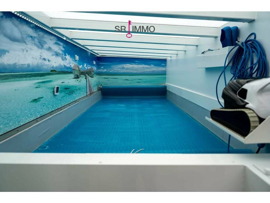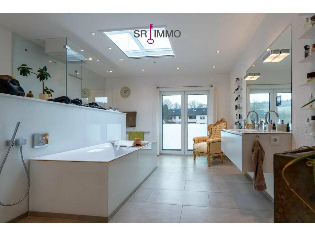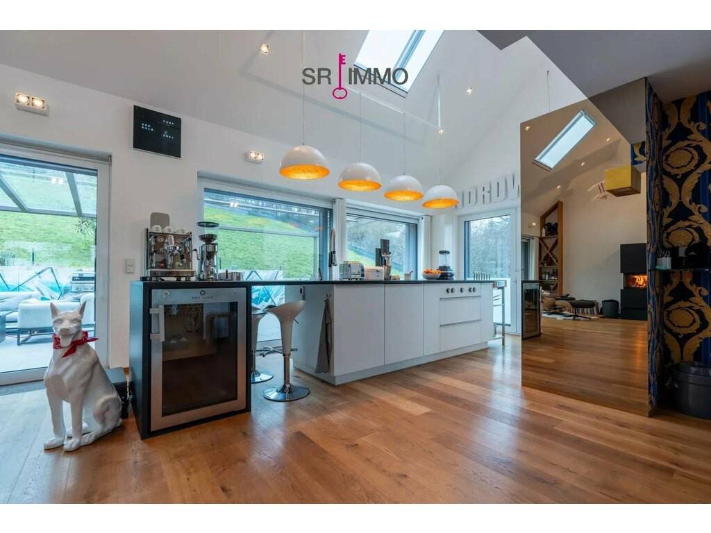 Im Innenbereich sorgt eine Luft-/Wasser-Wärmepumpe mit integrierter Zentralheizung für effizientes, behagliches Wohnen. Der Wohnkomfort wird durch offene Raumstrukturen und hochwertige Material- und Ausstattungsdetails weiter gesteigert. Ein kleiner Schwimmbadbereich mit Gegenstromanlage und automatisierter Chlor- und pH-Kontrolle lädt zum Relaxen ein und bietet auch Wellness-Optionen direkt im Eigenheim. Die Sauna mit Kupfer-Mosaik-Sitz ergänzt das Entspannungskonzept und rundet das Wohlfühlangebot ab.