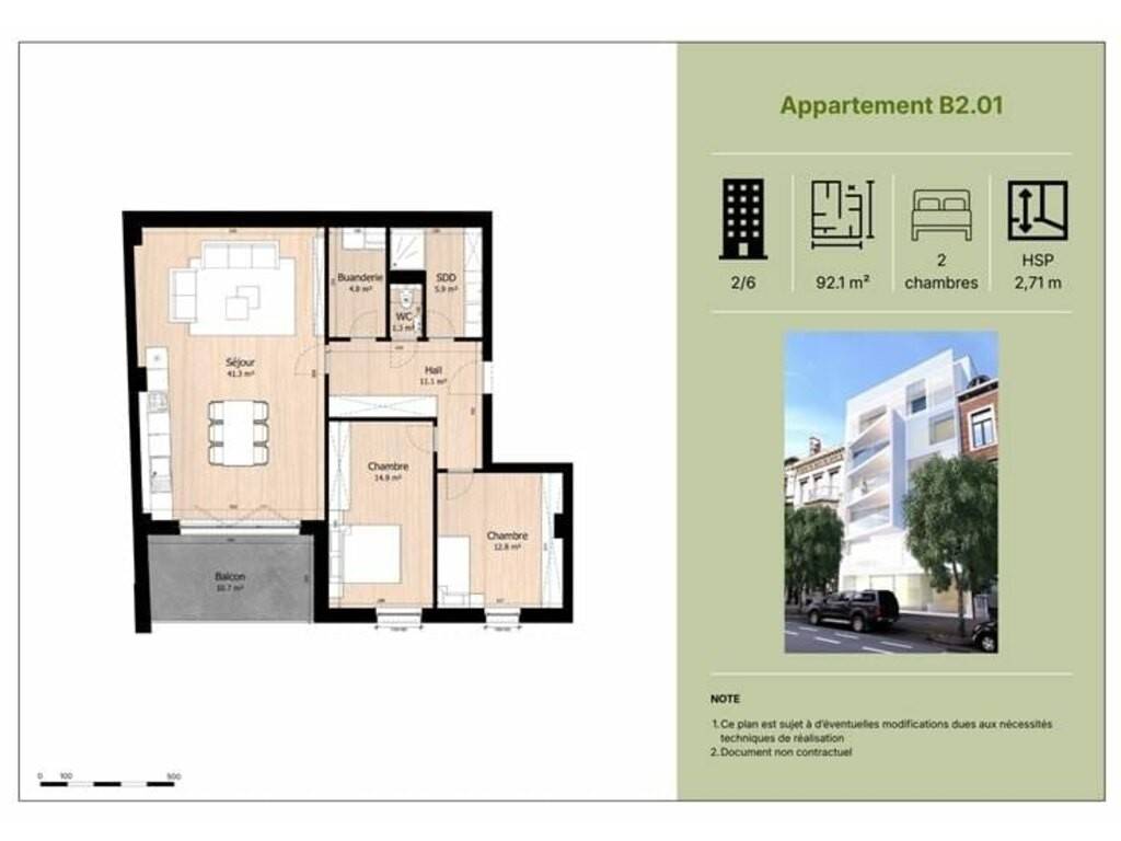 Composition : salon / salle à manger / cuisine ouverte de 41 m², 2 chambres (15 et 13 m²), salle de douche, salle de bain, buanderie et WC séparé.