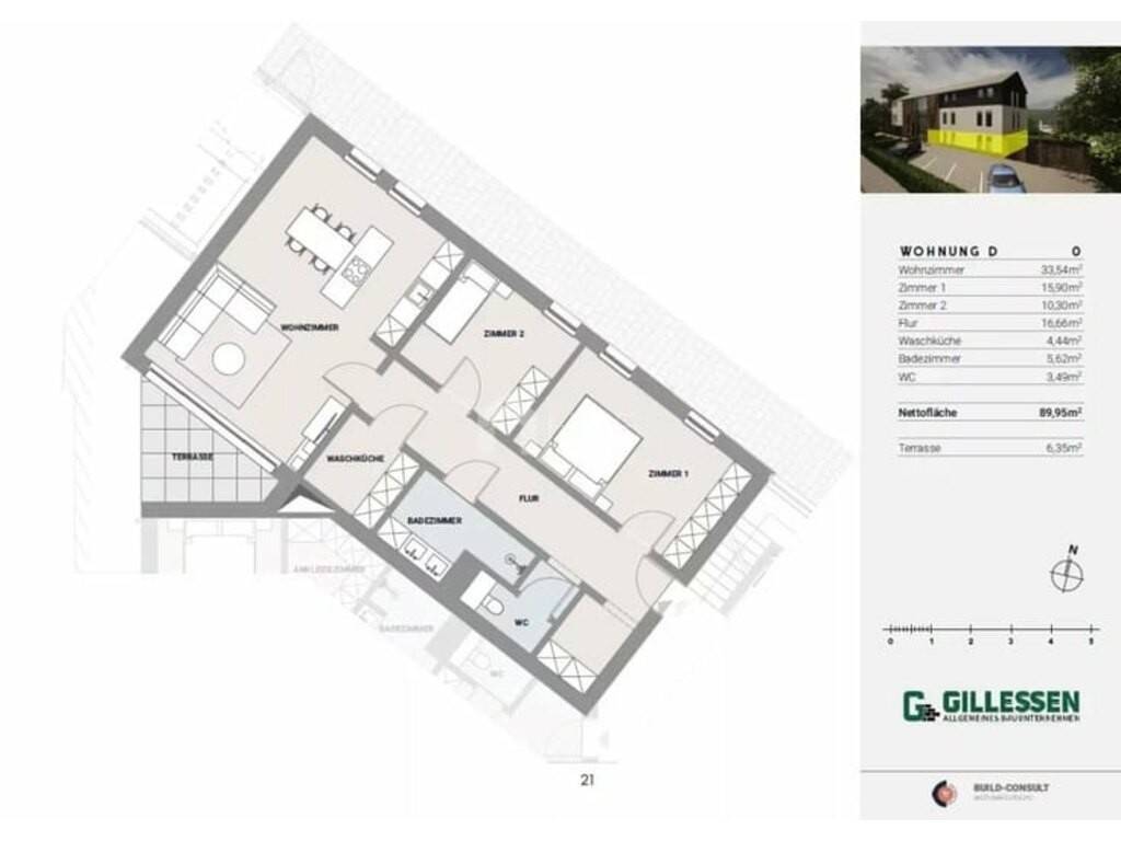 living/cuisine (33,54 m²) - 2 chambres à coucher (15,90 m² & 10,30 m²) - hall (16,66 m²) - buanderie (4,44 m²) - salle de bains (5,62 m²) - WC (3,49 m²) - terrasse (6,35 m²) - cave - 2 places de parking extérieures - jardin (45,4 m²).