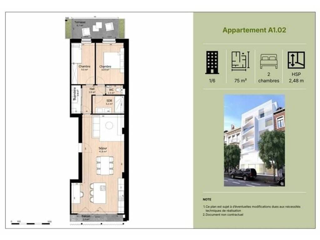 Composition : séjour / cuisine ouverte lumineux, 2 chambres, 1 salle de douche, WC séparé et terrasse de 12m²
