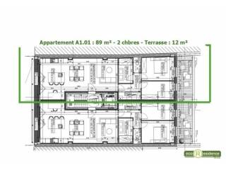 Composition : séjour / cuisine ouverte lumineux, 2 chambres, 1 salle de douche, WC séparé et terrasse de 12m²