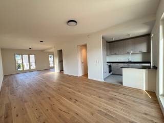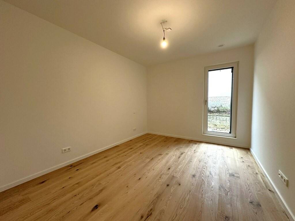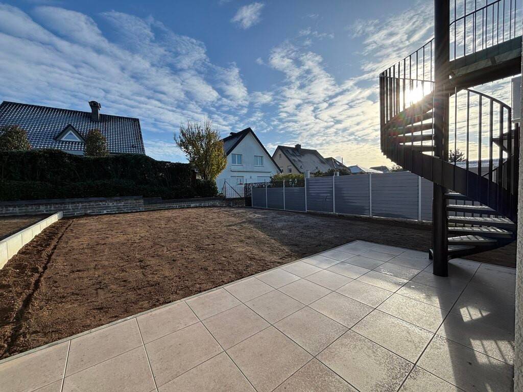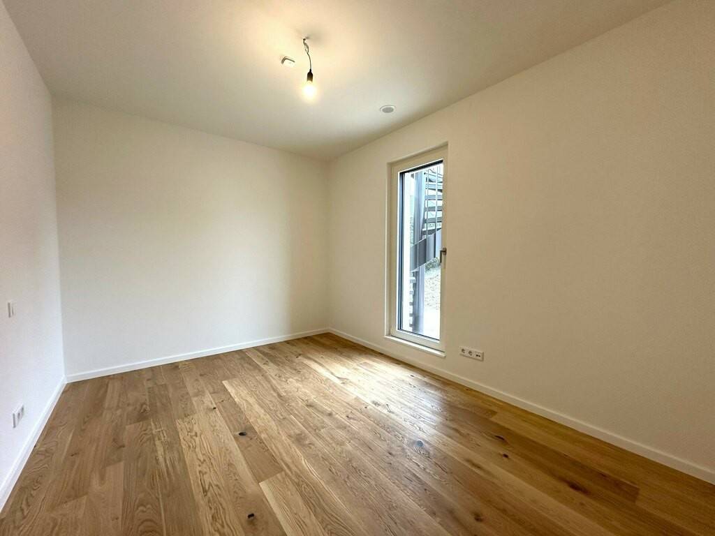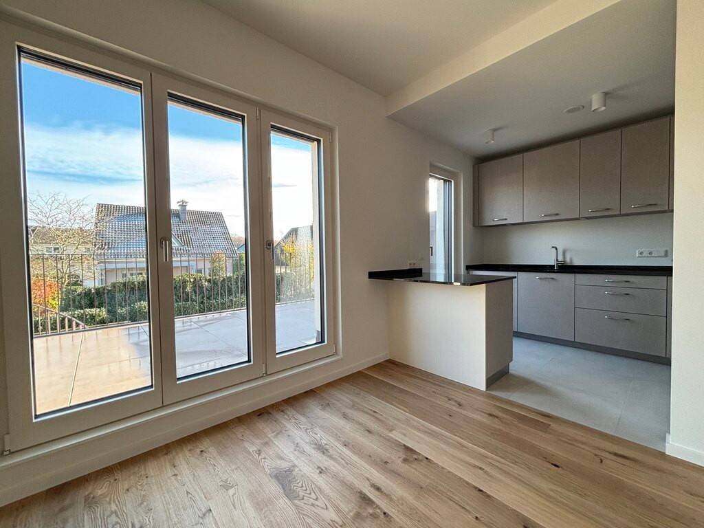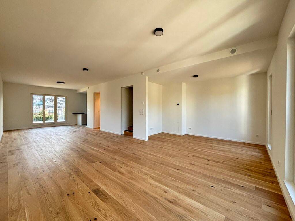Ein großer, heller Wohnraum mit einer Gesamtfläche von +/-60m2, bestehend aus Wohnzimmer, separatem WC, Esszimmer und Einbauküche mit direktem Zugang zur hinteren Terrasse von 19m2. Von der Terrasse aus gelangt man über eine Wendeltreppe in den Garten.