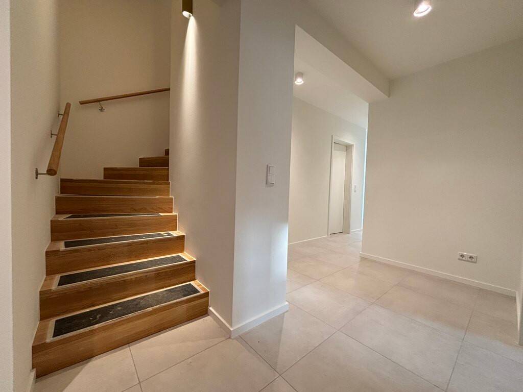 Eine geräumige Eingangshalle mit einer Garderobe und Zugang zum hinteren Garten. Drei Schlafzimmer, ein Duschbad und eine separate Toilette vervollständigen das Stockwerk. Im Außenbereich befinden sich zwei Parkplätze, von denen einer mit einem Carport und einer Ladestation überdacht ist, sowie ein Abstellplatz für Fahrräder und Mülltonnen.