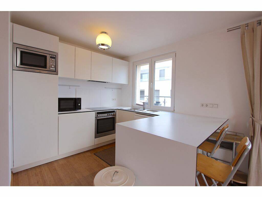 Die Wohnung befindet sich im 4. Stock und besteht aus: - einem Eingangsbereich, - einer voll ausgestatteten offenen Küche, - einem großen Wohn-/Esszimmer mit Zugang zur Terrasse, - einem Schlafzimmer mit Zugang zur Terrasse, - einem Badezimmer mit WC und ebenerdiger Dusche, - einem privaten Keller, - einer geschlossenen Garage (optional für 250 €).
