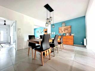 Le rez-de-chaussée s’ouvre sur un hall d’entrée accueillant qui dessert un vaste séjour baigné de lumière, ouvert sur une salle à manger conviviale. La cuisine moderne et entièrement équipée, ouverte sur l’espace repas, donne directement accès à la terrasse principale et au jardin orientés sud, parfaits pour profiter des journées ensoleillées. Un WC séparé complète ce niveau.