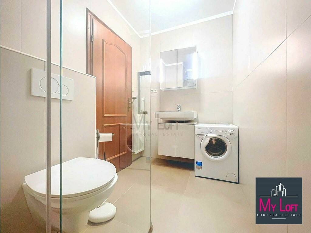 - Fully tiled bathroom with walk-in shower, vanity sink, wall-mounted toilet, and washing machine connection