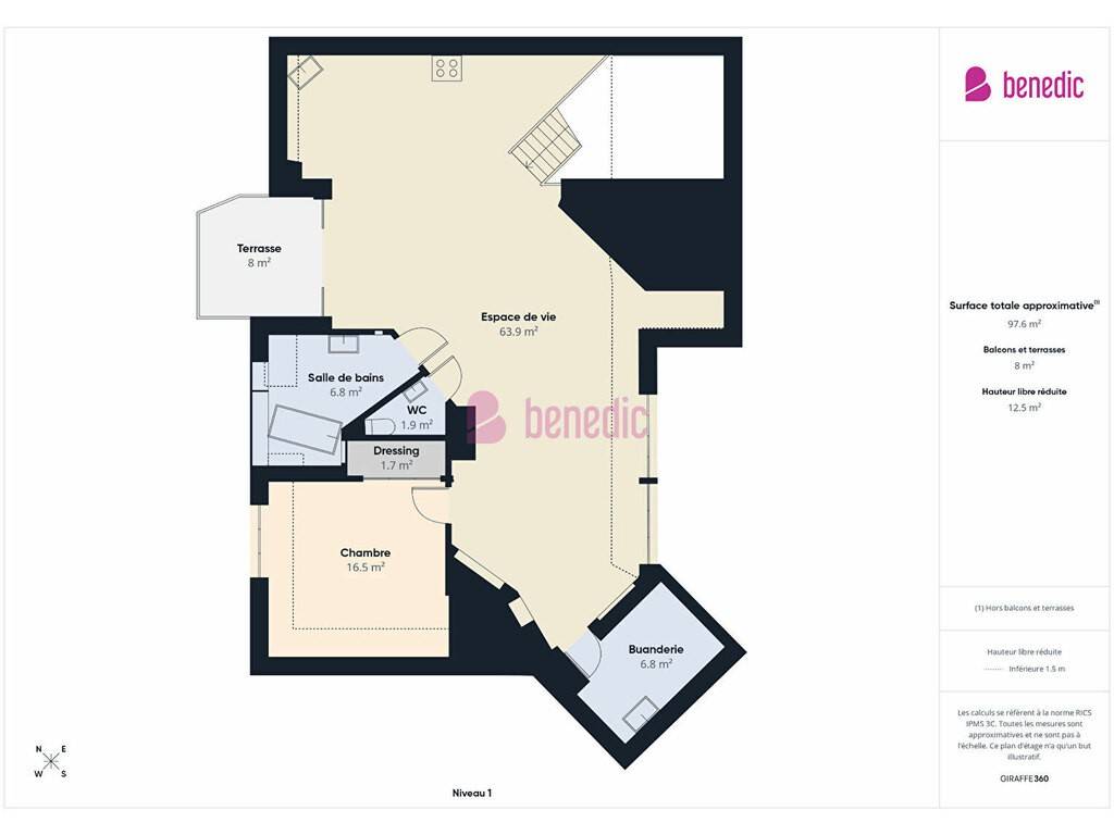 A l'étage, un espace salon-séjour-cuisine ouvert de 58 m² carrez soit 75 m2 au sol, un w-c, une salle de bains, une chambre avec placards, un buanderie et cerise sur la gâteau, une tropézienne de 8m² exposée Ouest à couper le souffle!