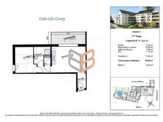Une résidence principale ? Un projet locatif ? Une défiscalisation ? La résidence Coté Village est faite pour vous ! N’hésitez pas et venez découvrir ce nouveau programme neuf en plein cœur du village de Coin-Les-Cuvry. Idéalement situé sur l'Axe Luxembourg - Nancy, ce village bénéficie d'une facilité d'accès aux principaux axes routiers, d'une proximité avec l'aéroport régional et la gare 'Lorraine TGV'. Le récent développement de zones commerciales comme le Waves à Augny ou encore l'arrivée du géant Amazon à 5 min de la résidence rendent ce projet très attractif. Appartements du T2 au T3 disponibles dans une résidence de qualité et sécurisée. Appartement de 44,86 m² au 3ème étage comprenant une entrée, un espace de vie ouvert donnant accès à un balcon de 10,04, 1 chambre et 1 salle d'eau. Possibilité de parking extérieur, parking en sous-sol ou box fermé en sous-sol en sus. Prestations : parking sécurisé, terrasse, volets électriques dans la partie séjour, chauffage gaz conforme au RT 2012, vidéophone, isolation phonique et thermique renforcée RT 2012, DPE étiquette B. Programme éligible au prêt à taux zéro et frais de notaire réduit. Travaux en cours Pour tout renseignement, n'hésitez pas à nous contacter au 06 14 43 29 28 (Agence : 03 82 82 35 69) Pour votre confort, nous vous recevrons sur rendez-vous dans nos bureaux à Metz. Venez découvrir l'ensemble de nos offres sur notre site internet www.scbi.eu