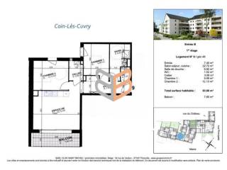 Appartement de 63,66 m² au 1er étage comprenant une entrée, un espace de vie ouvert donnant accès à un balcon de 7,60 m2, 2 chambres et 1 salle d'eau.
