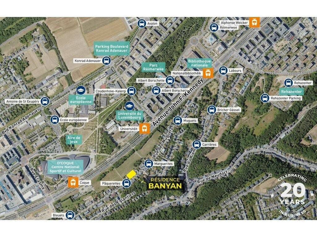 Situé dans un environnement résidentiel paisible et verdoyant, la résidence « Banyan » à 83 –91, rue des Muguets bénéficie d'un emplacement stratégique à Luxembourg-Weimershof, à la frontière immédiate du Kirchberg. Ce quartier calme et recherché séduit par sa qualité de vie, tout en offrant un accès immédiat aux infrastructures les plus modernes de la capitale. La résidence sera implantée sur un terrain de ca. 19,60 ares.