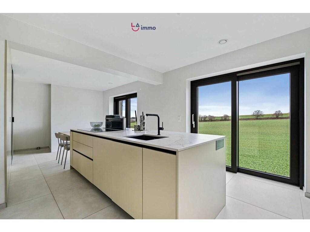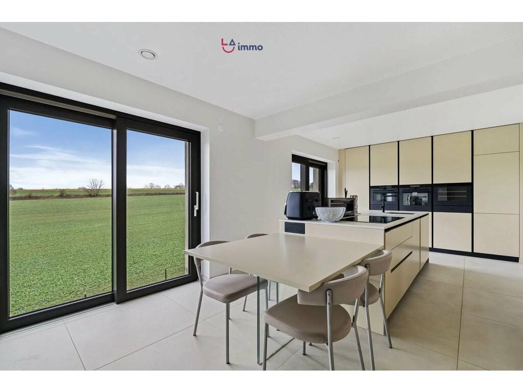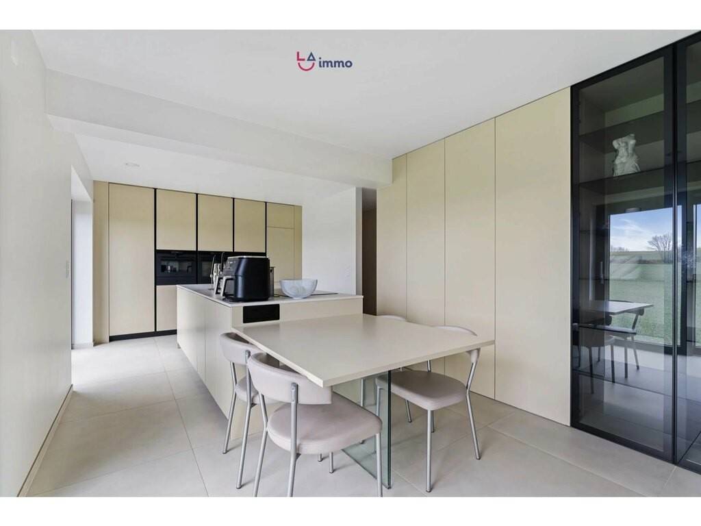 Upon entering, you are welcomed by a bright and harmonious space: on one side a spacious living and dining area filled with light, on the other a stunning contemporary kitchen with panoramic views over the fields, fully equipped with AEG Black Mat appliances, including oven, microwave, warming drawer, induction hob, dishwasher, and wine cellar.
