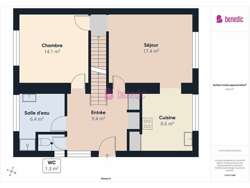 Rez-de-chaussée : Une entrée de 9 m² dessert un séjour, une cuisine indépendante, une chambre de 14 m² ainsi qu'une salle d'eau avec WC. Ce niveau permet une autonomie complète de plain-pied.