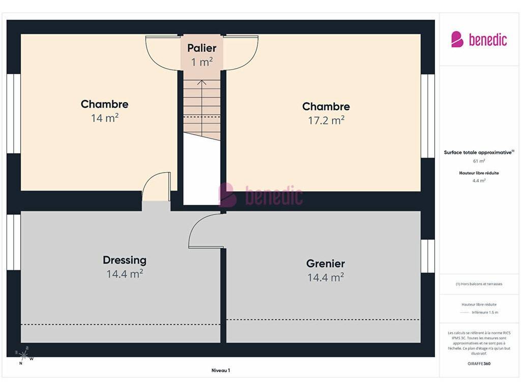 Étage : L'espace nuit se compose de deux chambres (14 m² et 17 m²), complétées par un dressing et un grenier. Ces volumes offrent un beau potentiel d'aménagement pour une famille.