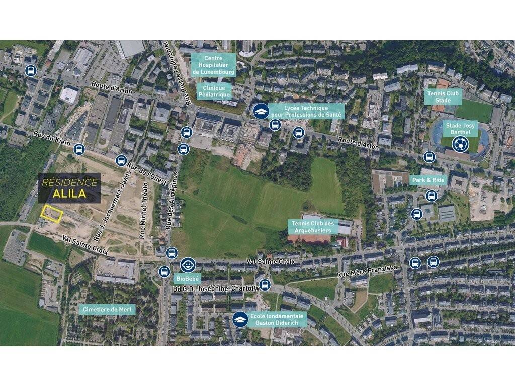 Mobility Right next to the residence, on rue du Kiem, is the "Belair, Rue de l'Ouest" bus stop, which is served by line 8 to Place de l'étoile, Hamilius and the Limpertsberg high schools, and on the other side to Strassen and Bertrange. Turning into Rue des Aubépines, you'll find a bus stop served by lines 13 and 24 to Le Bouillon, Hollerich and Howald, as well as the maternity hospital and the Centre Hospitalier.