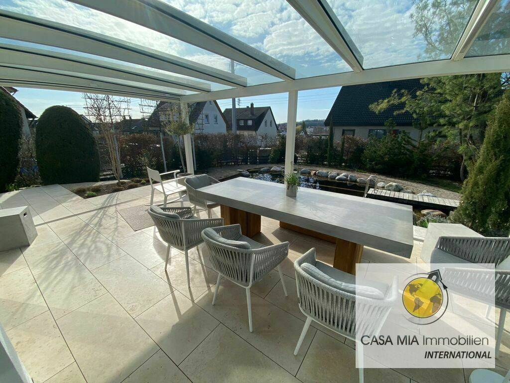 Modern renovierte, große überdachte Terrasse vor dem Essbereich mit Blick auf den neuen Garten mit Schwimmteich (Ruhepol: „Jeden Tag wie im Urlaub“), viel Platz zum Arbeiten von zu Hause aus (schnelles Internet vorhanden), Kamin und Ölzentral Heizung (Tank im Außengelände), Sauna, Hochgarage und 2 Stellplätze...
