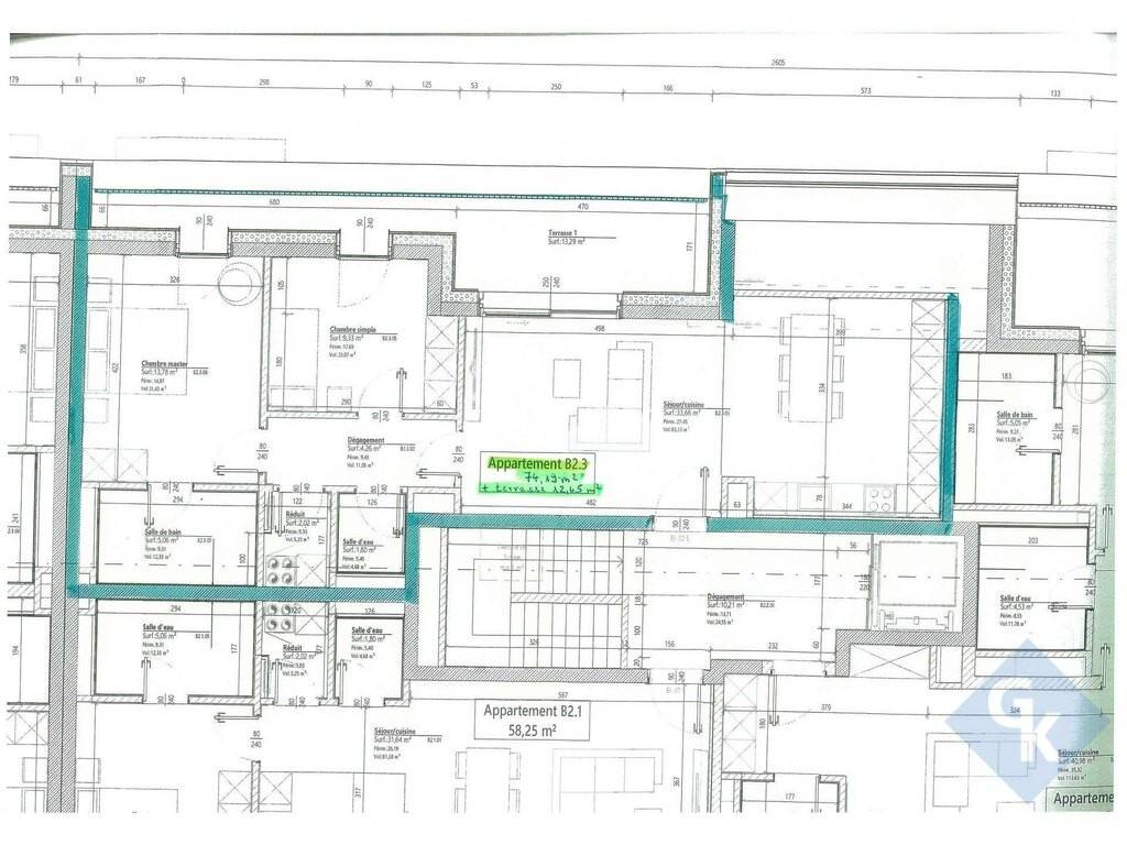 Composition de l'appartement B 2.3 d'une surface habitable de 74.19 m² + balcon de 12.65 m² (pris pour 40 % dans la surface totale utile) :