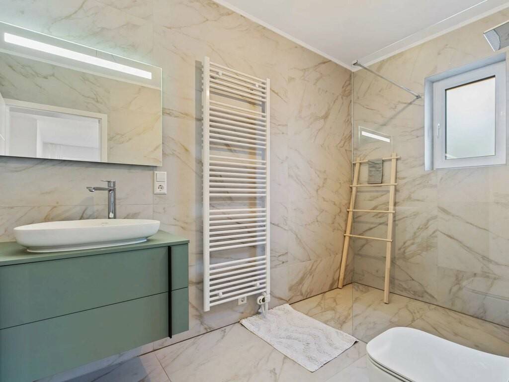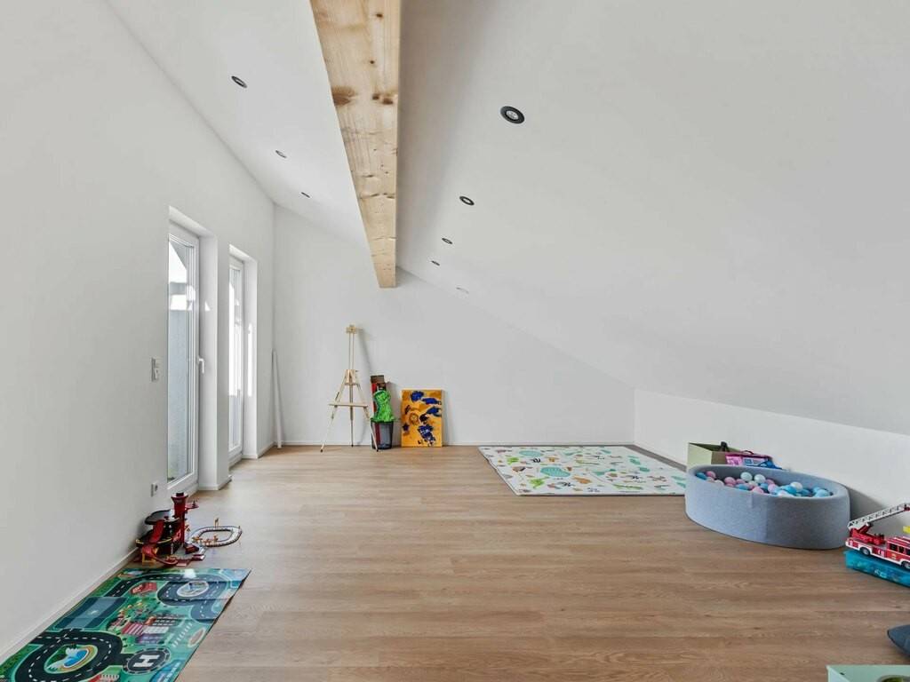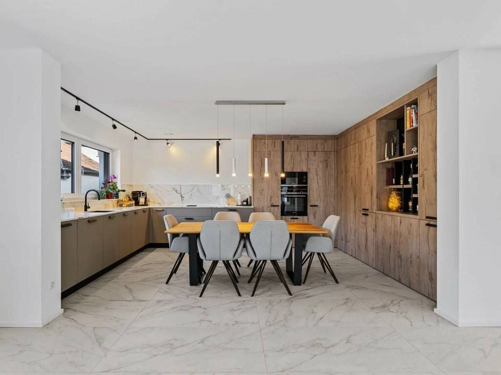 This is where you'll find a large, light-filled living area of approx. 42m2, comprising a superbly equipped open-plan kitchen with a large dining table, and a lounge area with a nice built-in cupboard. Next to the hall and stairwell is a utility room and separate WC, as well as the access to the garden area and terrace at the rear of the house.