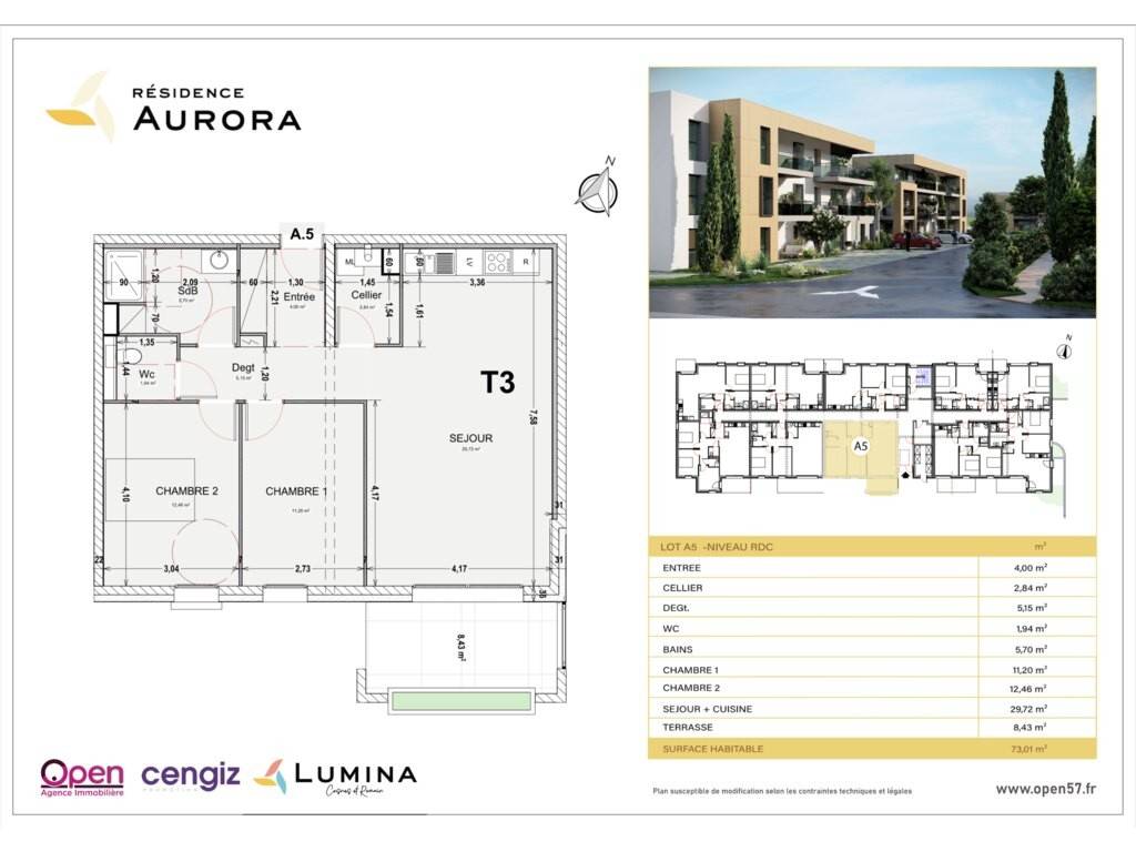 Découvrez le Lot A5, un appartement de type T3 situé au rez-de-chaussée de la résidence. Il offre une surface habitable de 73,01m², complétée par une terrasse de 8,43m², parfaite pour profiter des beaux jours. Ce bien moderne et lumineux est proposé au prix de 263 000 €.