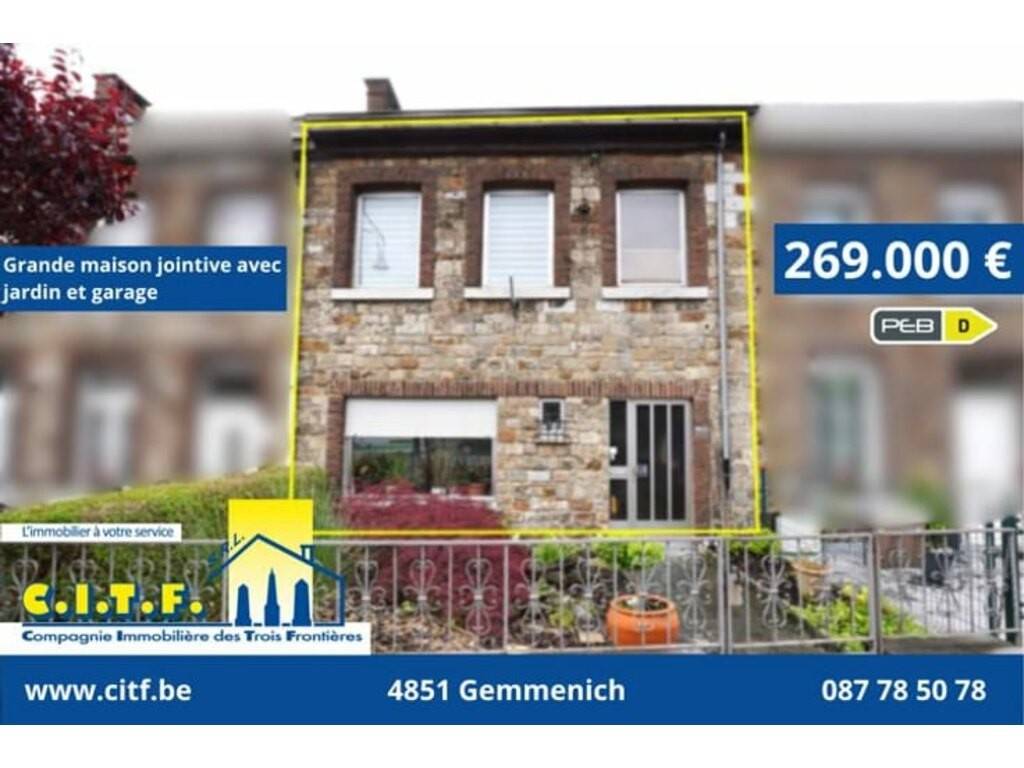Très grande maison jointive en pierres du pays, avec grand jardin et garage, sise au centre de La Calamine, Route de Liège 203, accessible également par l'arrière.