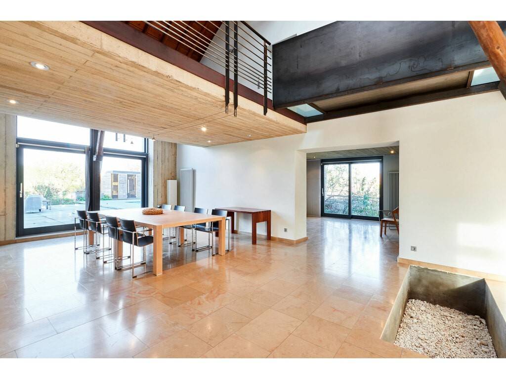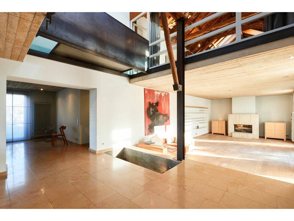 The ground floor open onto the hall with on the left an office space and on the right a beautiful foyer with steel staircase which leads to the main living room with exposed beams and high ceilings in exposed concrete.