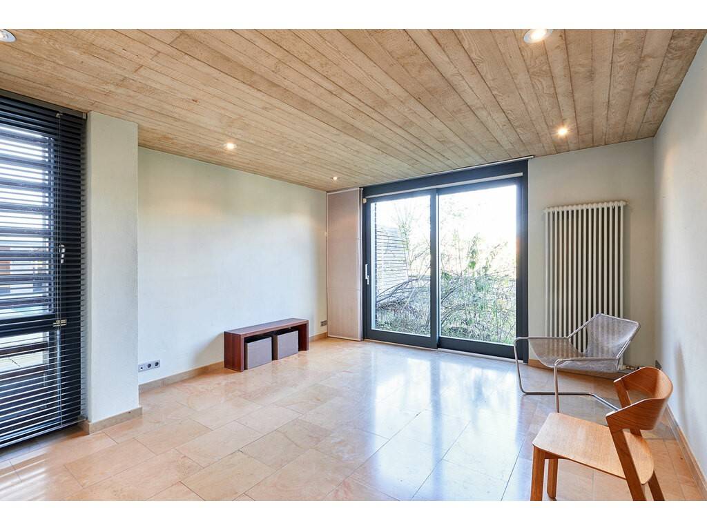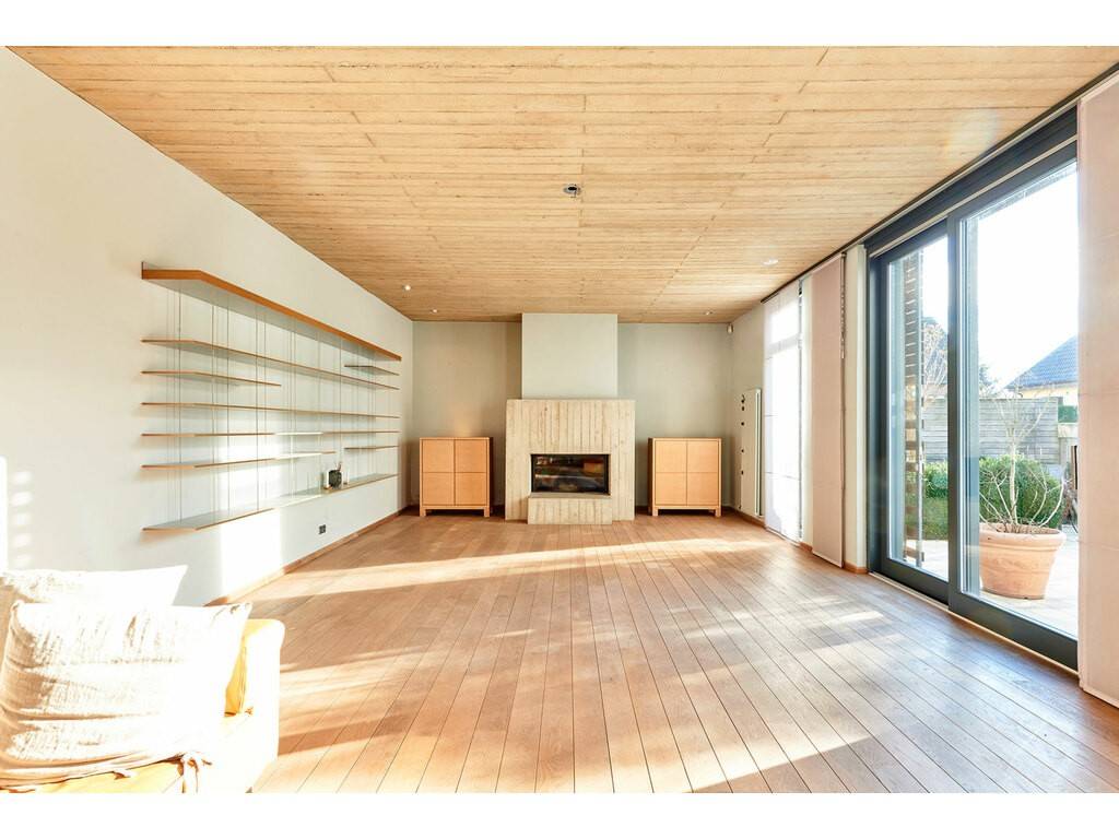 This living area includes a large living room with fireplace and a dining room in split level with floor-to-ceiling windows offering an outstanding view over the surrounding nature and over the outdoor spaces with large terrace, garden, heated swimming pool and sauna.