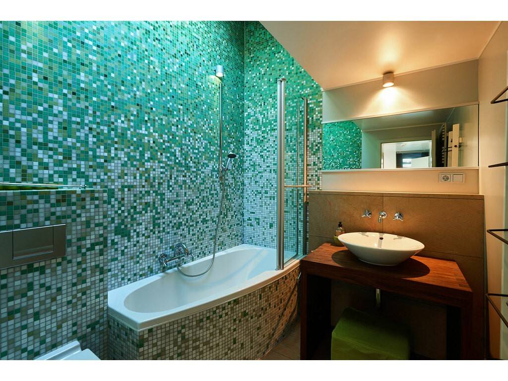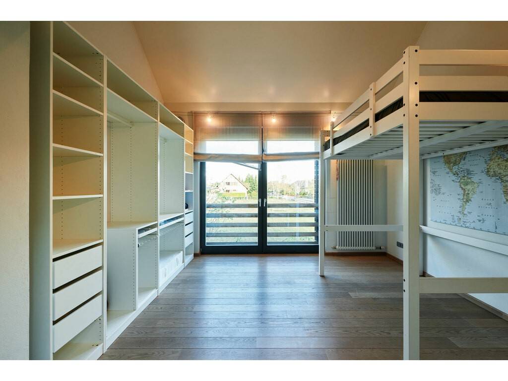 Airy and light-filled, the upper floor houses a mezzanine which harmoniously combines wood, glass and metal. This floor enjoys a night landing with view over the lower level accomodated into a small lounge, a master bedroom with stove, walk-in closet and en suite bathroom including double washbasin, tub, shower and toilets. A second bedroom with adjoining shower room complete this part of the house.