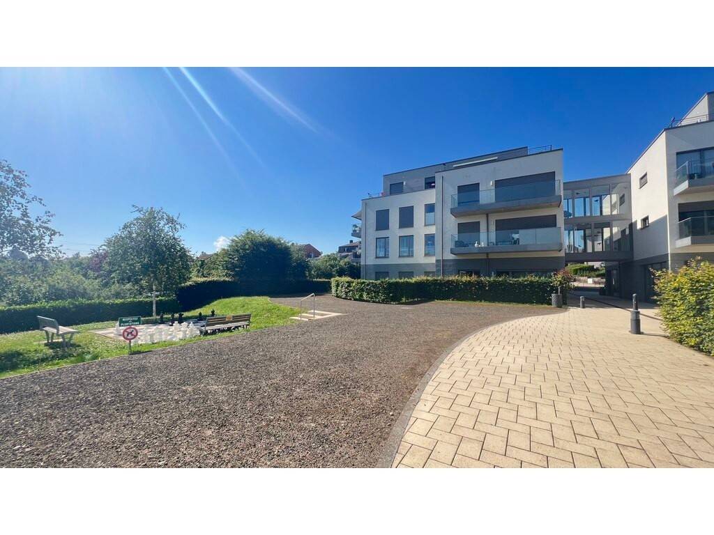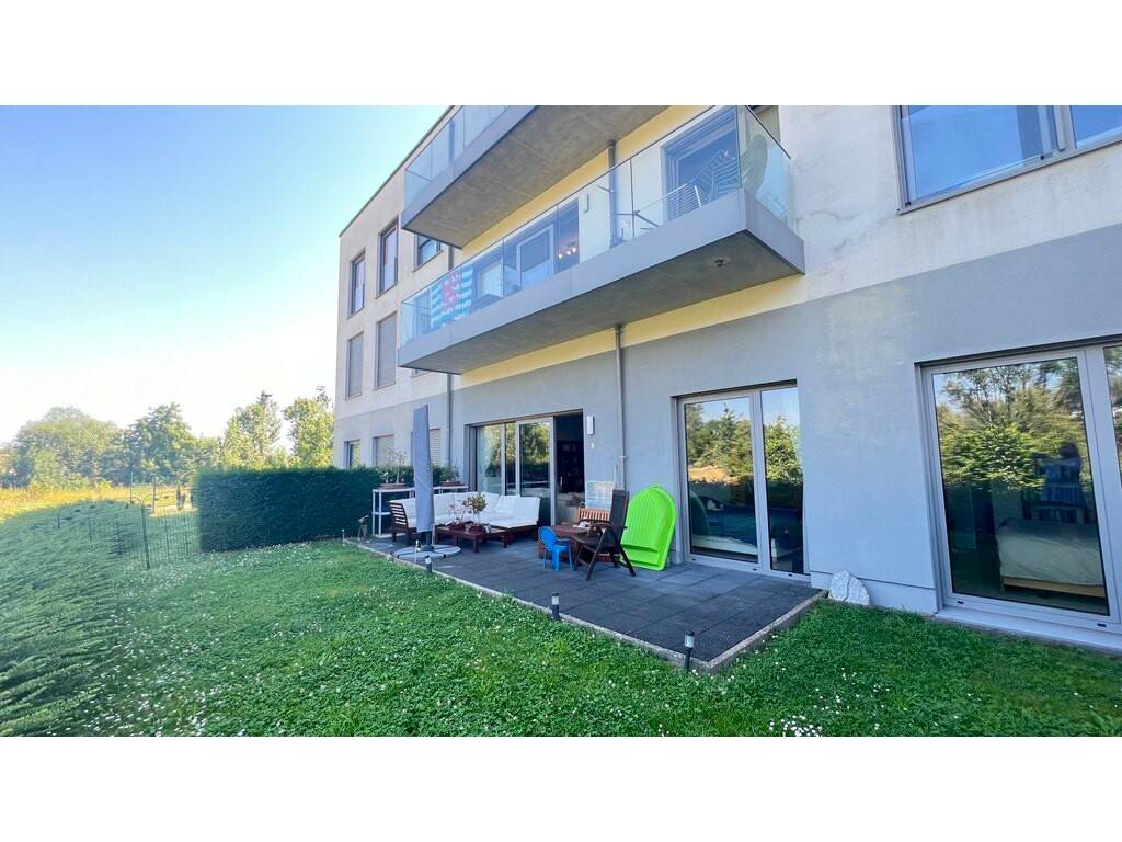 Hall d'entrée, belle cuisine entièrement équipée ouvert sur living avec accès sur grande terrasse et son jardin privatif, 2 chambres à coucher, WC séparé, salle d douche et WC, débarras avec connection pour machine à laver. Cave et emplacement intérieur.