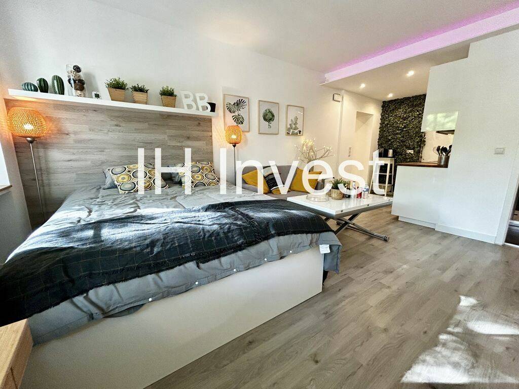 - a living room (living/bedroom), with wooden flooring, queen size bed (2 places 160cm), sheets, duvet, duvet cover, wardrobe, 2-seater sofa, lighting, flat screen with Chromecast, equipped desk, etc.