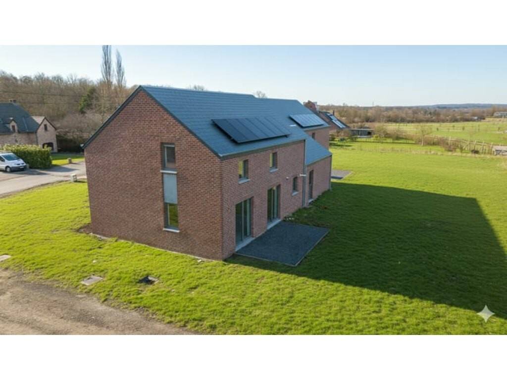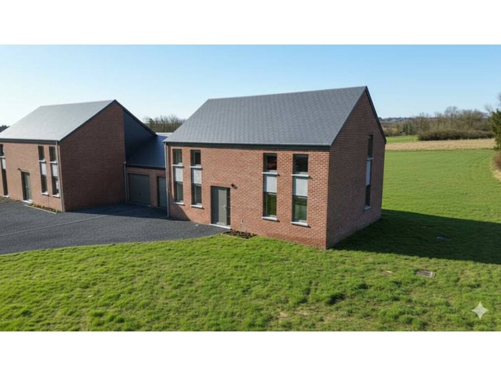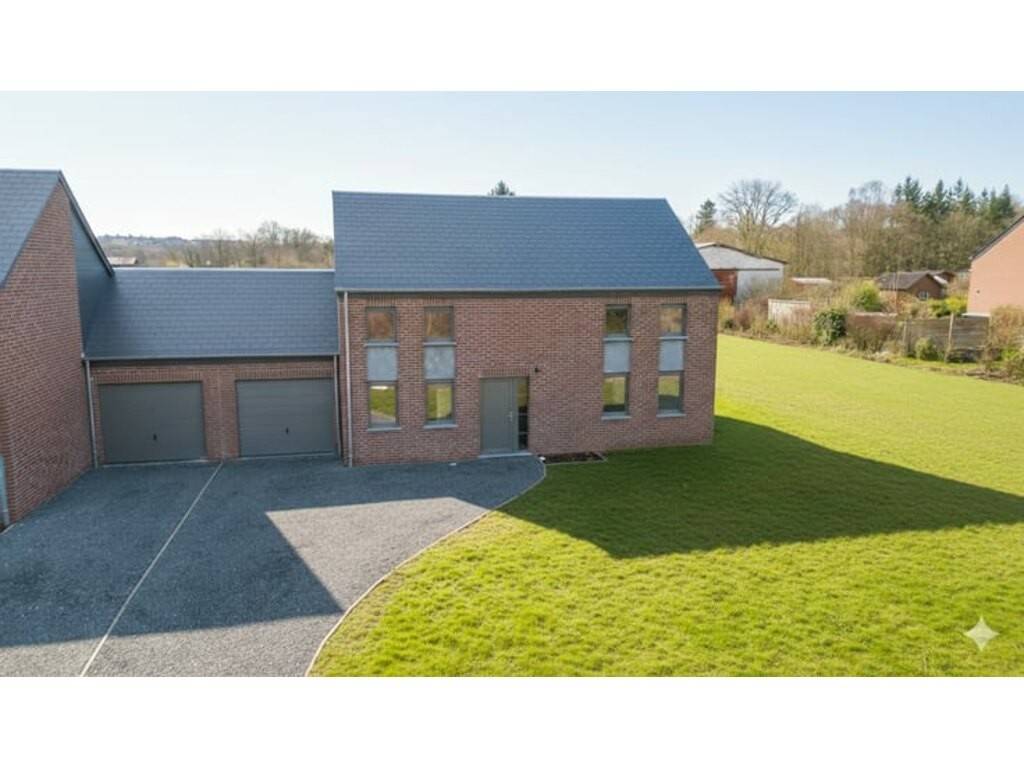 Cette maison neuve est implantée dans un quartier résidentiel calme d’Aye, à quelques minutes du centre de Marche-en-Famenne. L’environnement est composé principalement de constructions récentes, dans une ambiance sobre et ordonnée, à proximité des principaux axes de desserte régionaux. La gare de Marche-en-Famenne se trouve à +/- 8 minutes en voiture. L’accès à la N4 est direct, à moins de 5 minutes. Plusieurs établissements scolaires sont accessibles dans un rayon de +/- 3 km, tout comme une crèche. Un médecin généraliste et une pharmacie sont situés à +/- 2,5 km. Un supermarché, une boulangerie, une banque et une salle de sport sont tous situés entre 5 et 10 minutes de la propriété. Le bien est une maison quatre façades, développée sur un terrain de +/- 9,62 ares. Elle dispose d’une terrasse orientée plein sud et d’un garage intégré de +/- 18 m². Sa surface habitable totale est de +/- 181 m², répartie sur deux niveaux. Le rez-de-chaussée comprend un hall d’entrée avec WC, un séjour lumineux de +/- 28 m², une cuisine non équipée de +/- 11 m², une buanderie de +/- 9 m² et un bureau de +/- 11 m². À l’étage, le hall de nuit dessert une chambre parentale avec dressing de +/- 17 m², deux autres chambres de +/- 13 m² chacune, ainsi qu’une salle de bain de +/- 11 m² équipée d’une baignoire et d’une douche. Le chauffage est assuré par une installation au gaz. La maison est équipée de 6 panneaux photovoltaïques et bénéficie d’un PEB de catégorie A