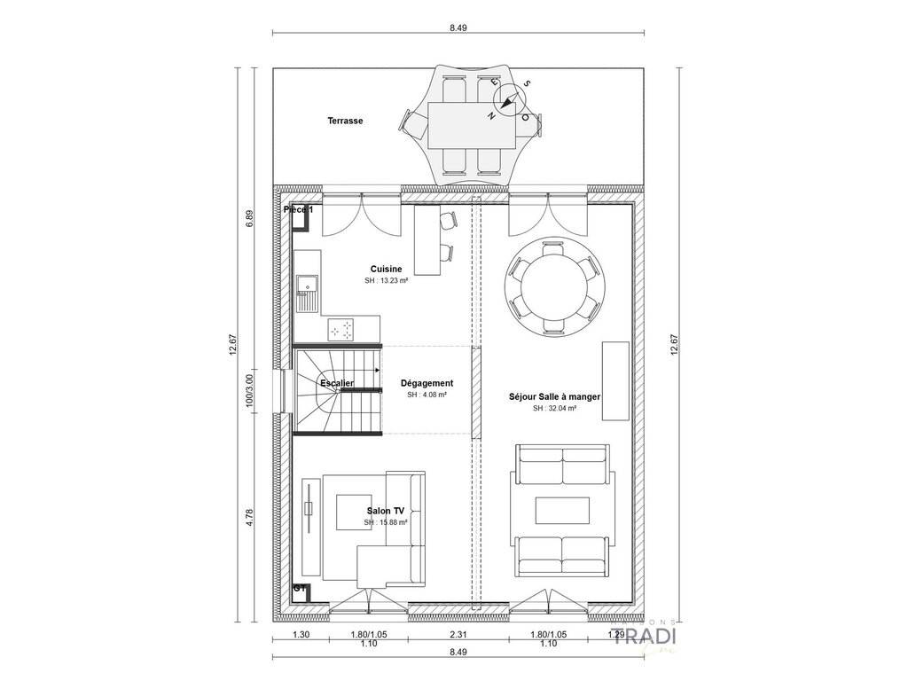• Rez-de-chaussée : un espace de vie lumineux de 60 m² ouvert sur la cuisine, accès à l'étage et au sous-sol.