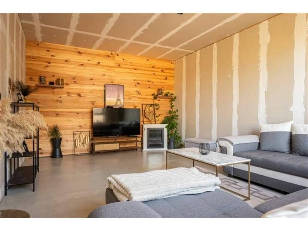 En cours de rénovation, il reste les finitions à personnaliser. La maison se compose d’un vaste hall d’entrée, d’un côté une grande salle à manger avec cuisine ouverte neuve, buanderie, chaufferie et salle de bain ; de l’autre, un salon cosy et une pièce lumineuse donnant sur la terrasse, idéale pour bureau, salle de jeux ou atelier ou chambre supplémentaire. L’ensemble du rez bénéficie d’un béton lissé contemporain.