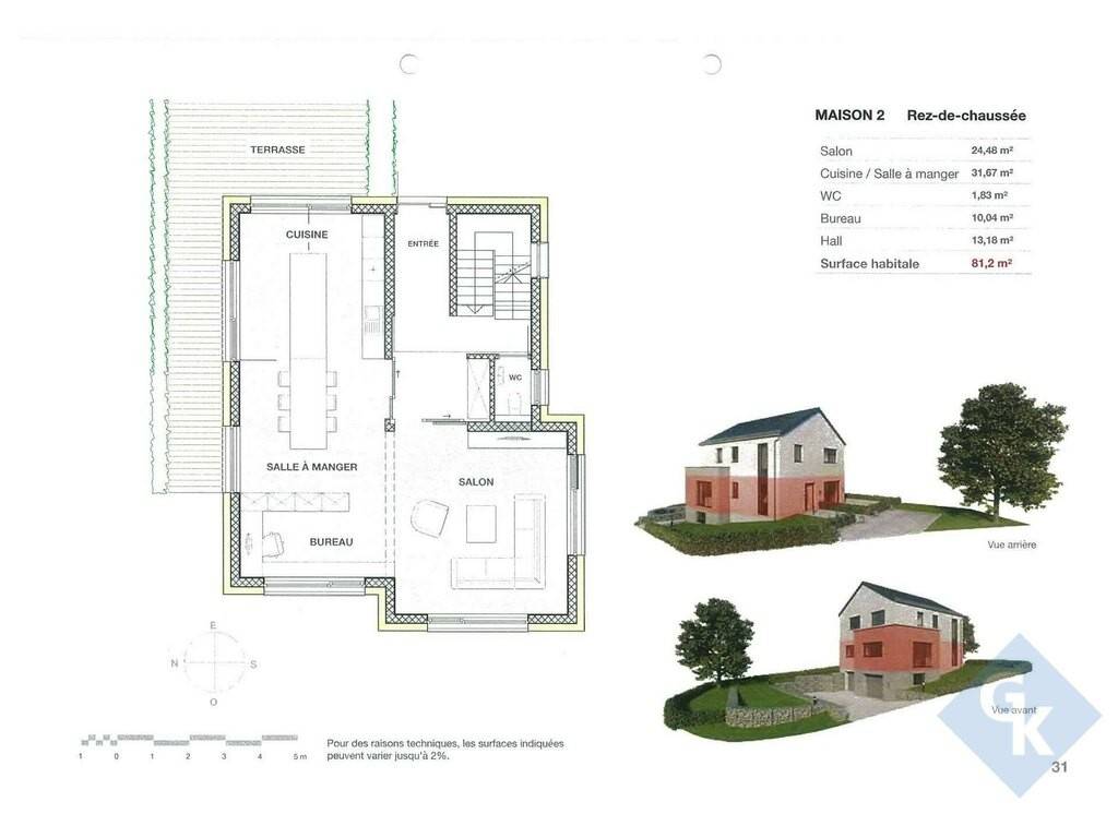 - rez-de-chaussée : hall d'entrée (13.18 m²) – cuisine ouverte avec salle à manger (31.67 m²) - séjour (24.48 m²) – WC séparé (1.83 m²) – bureau (10.04 m²) – terrasse (22.00 m²).