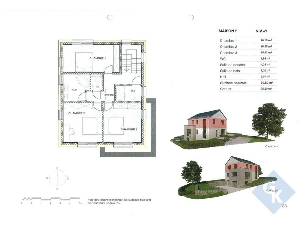 - 1er étage : hall (8.67 m²) – chambre 1 (16.18 m²) – chambre 2 (16.36 m²) – chambre 3 (15.97 m²) – salle de douche (4.38 m²) - salle de bains (7.20 m²) – WC séparé (1.86 m²) – grenier (25.20 m²).