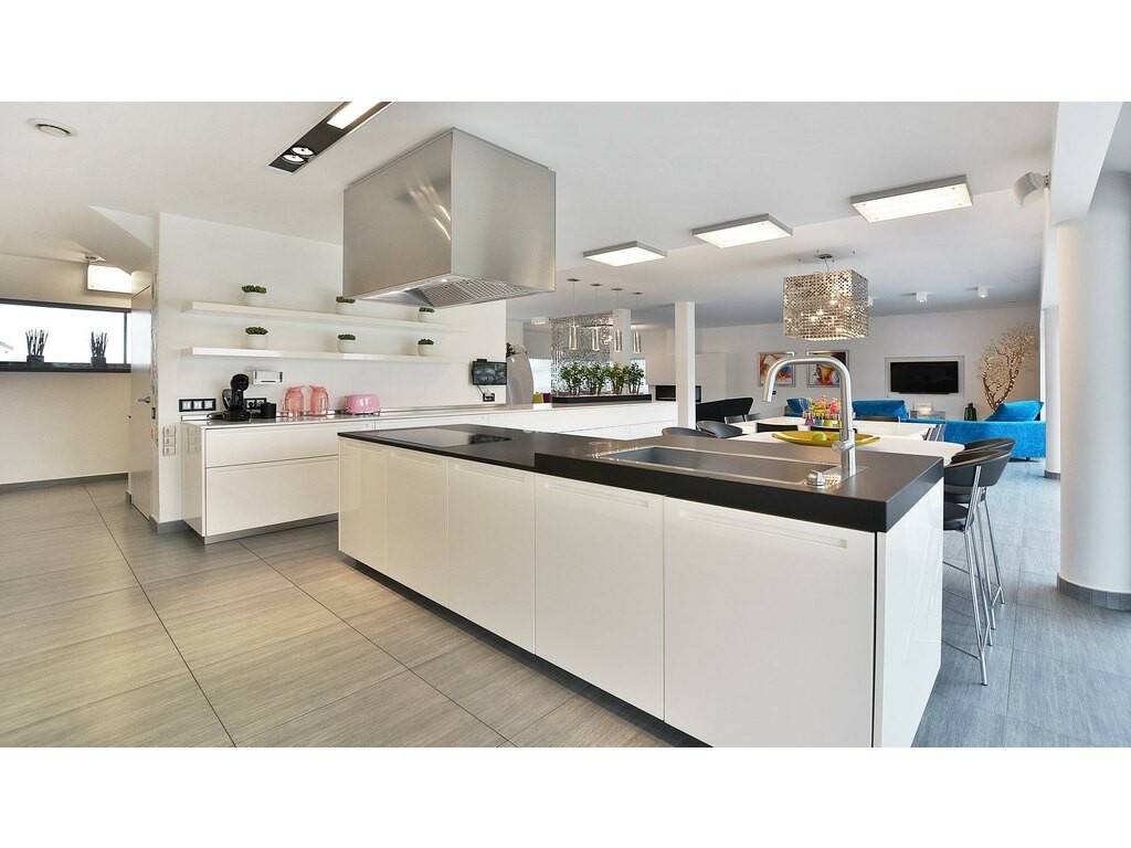 The fully-equipped designer kitchen, with its central island, combines aesthetics and functionality, with direct access to the outdoors for alfresco dining.