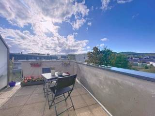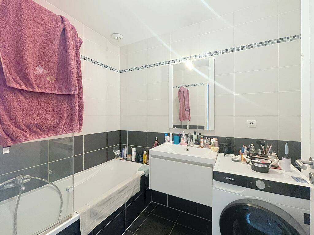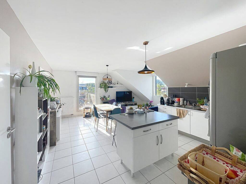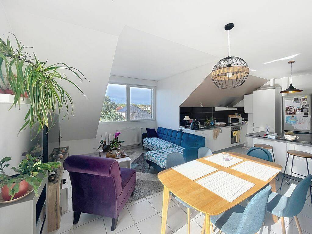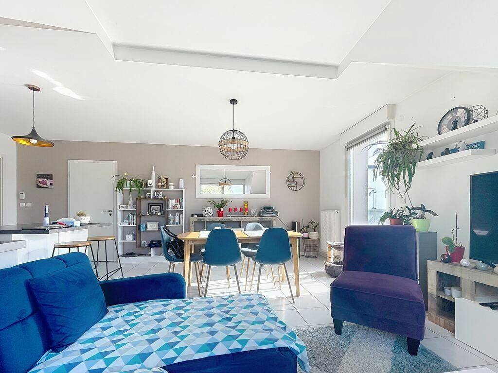 Appartement type T3 de 73.08m² situé au deuxième et dernier étage offrant : Une entrée avec placards, dégagement, une pièce à vivre lumineuse comprenant une cuisine équipée ouverte sur un salon-séjour avec accès terrasse (exposée SUD – SUD OUEST), deux chambres, une salle de bains, WC séparé.