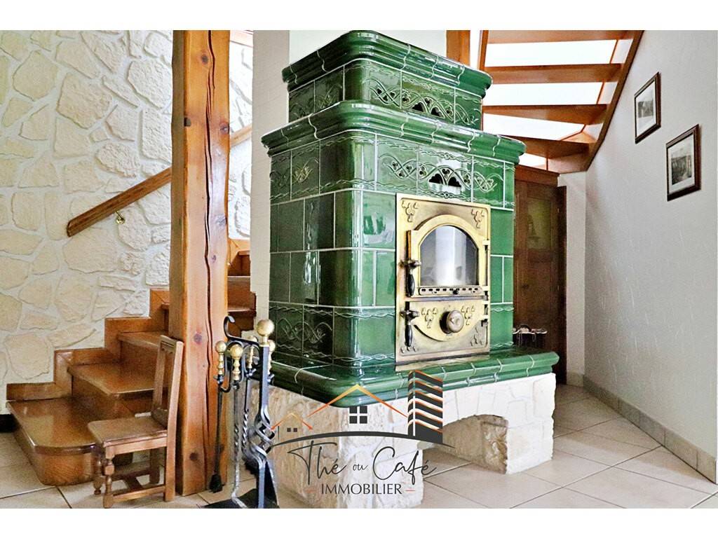 Double salon spacieux avec mezzanine, poutres apparentes et poêle en faïence.
