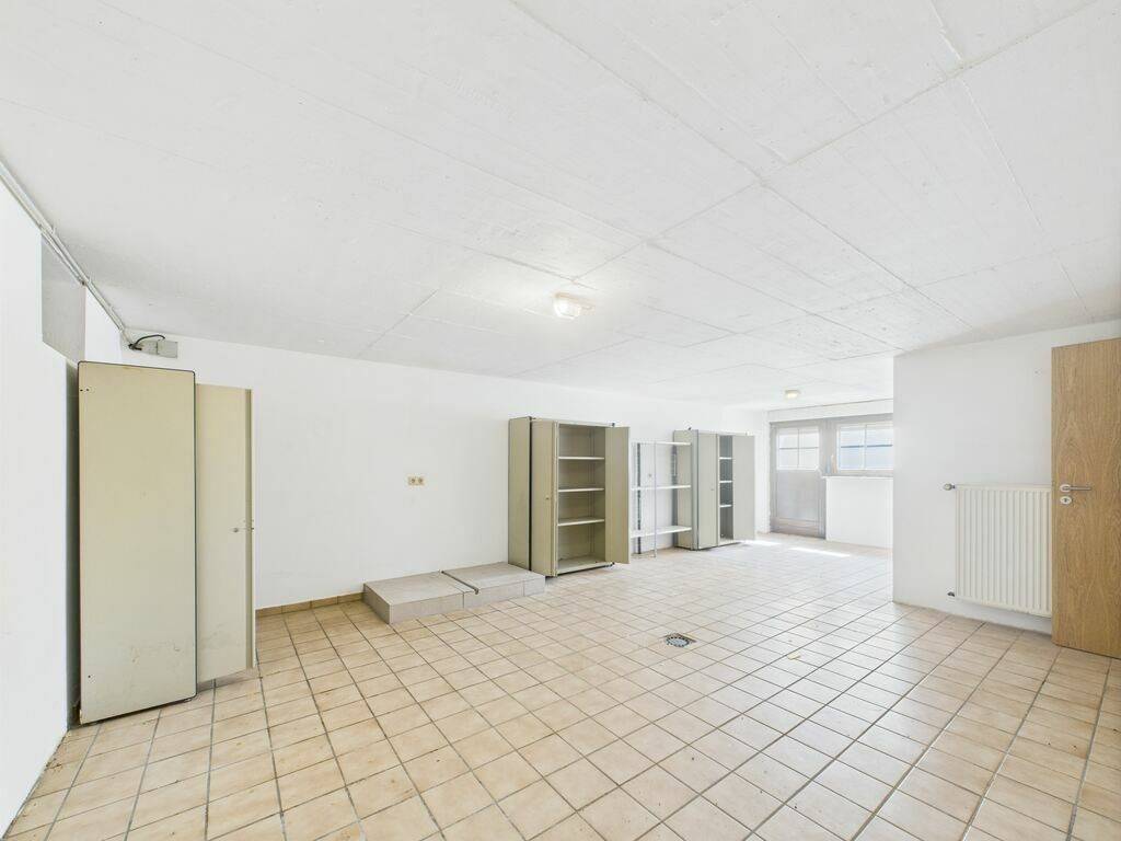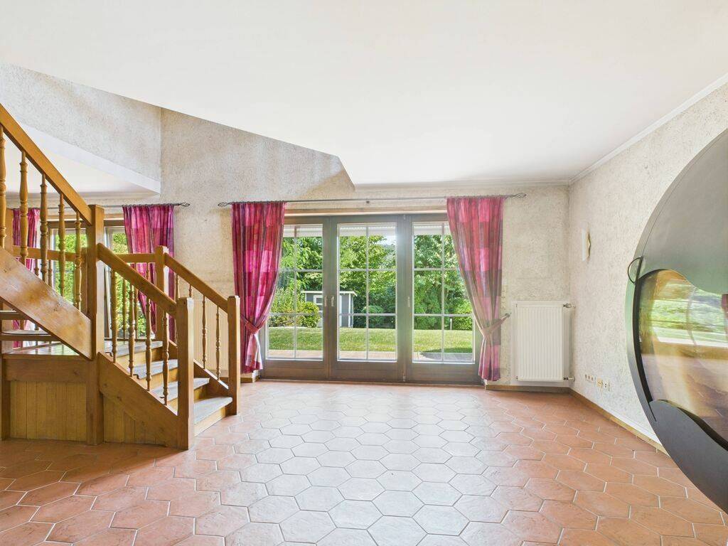 - Rez-de-chaussée : une cuisine séparée en bois entièrement équipée, un WC séparé avec lavabo ainsi qu'un spacieux living carrelé. Celui-ci est particulièrement lumineux grâce à ses deux doubles portes vitrées en bois donnant directement accès à la terrasse et au grand jardin.