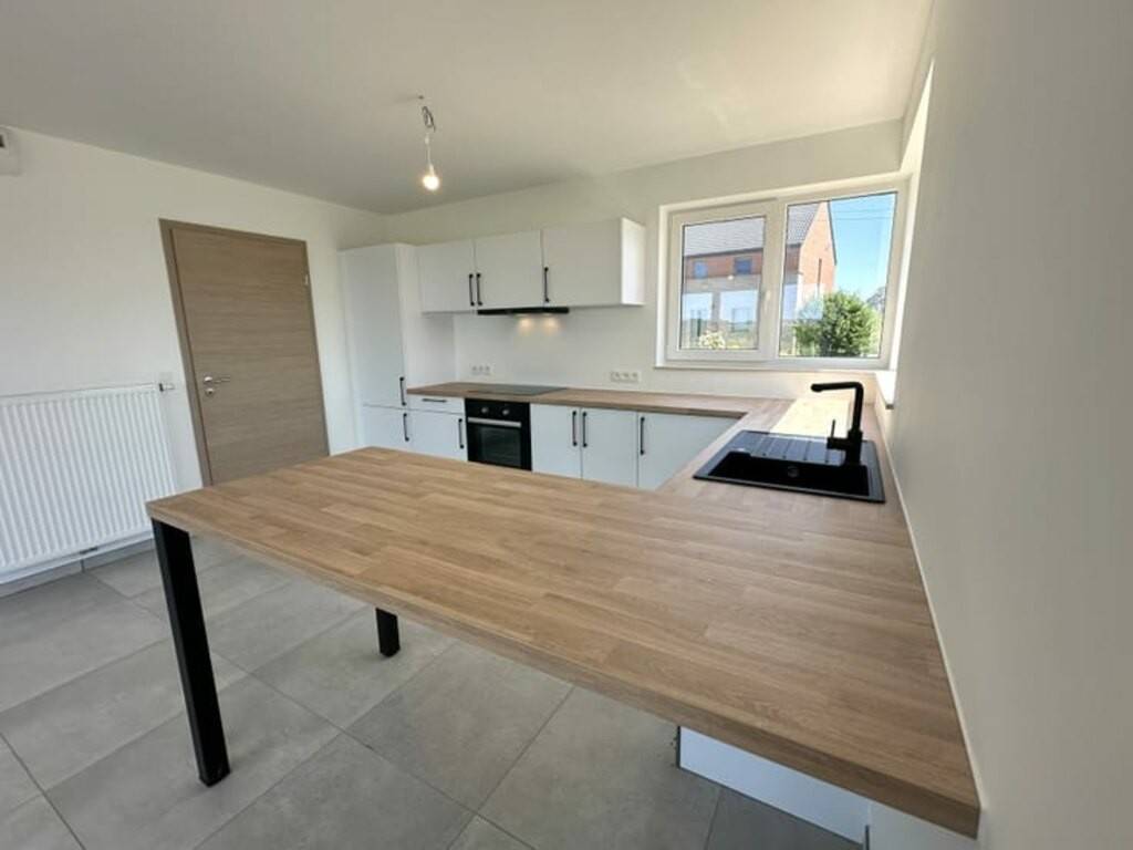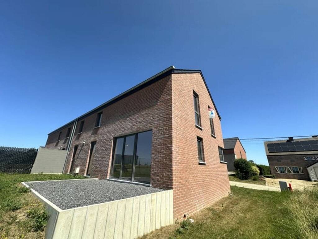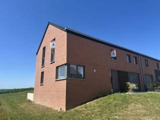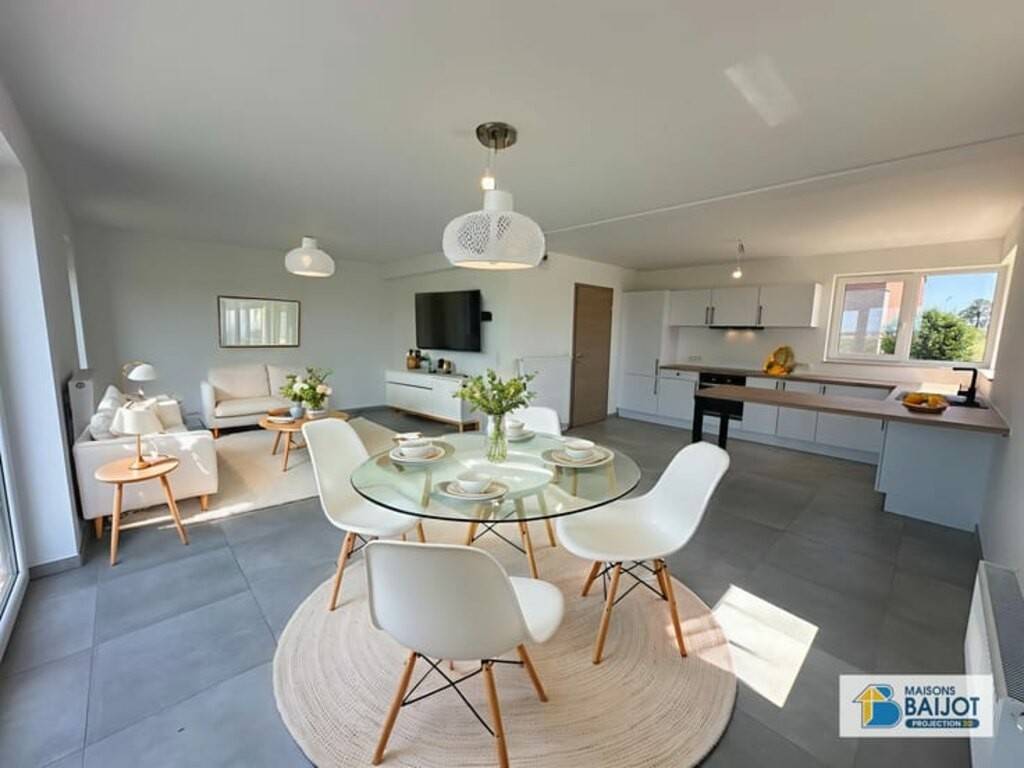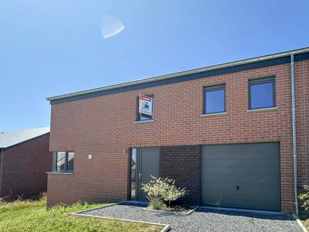 Rez-de-chaussée : hall d’entrée ± 4 m², WC séparé, séjour lumineux de ± 26 m², cuisine ouverte entièrement équipée de ± 10 m² (frigo, four, hotte, plaque vitrocéramique, lave-vaisselle), garage une voiture avec espace buanderie de ± 18 m², jardin avec terrasse exposés Sud-Ouest
