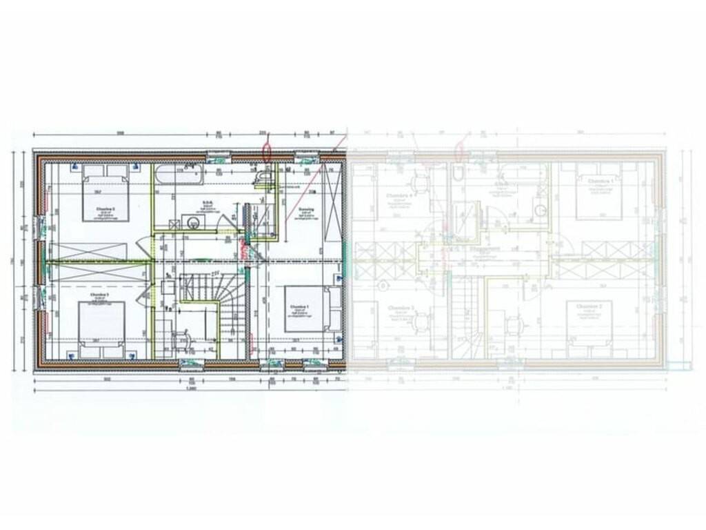 Étage : hall de nuit, 3 chambres (± 16 m² et deux de ± 12 m²), salle de bain équipée (douche 120/90, meuble vasque, WC)