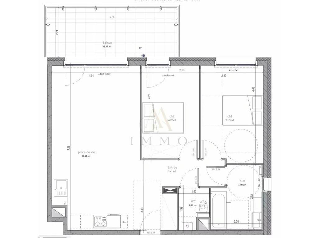 Hall d’entrée d’une surface de 3.41 m2, un WC séparé d’une surface de 2.20 m2, une salle de bain d’une surface de 6.00 m2, 2 chambres à coucher : surface de 12.15 & 10.95 m2, un séjour d’une surface de 32.33 m2 avec accès au balcon de 13.17 m2, espace cuisine ouverte sur le séjour, espace rangements de 1.11 m2