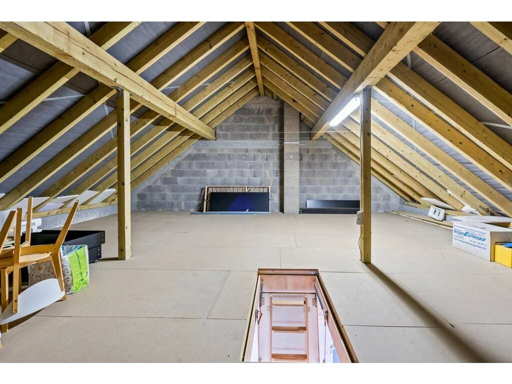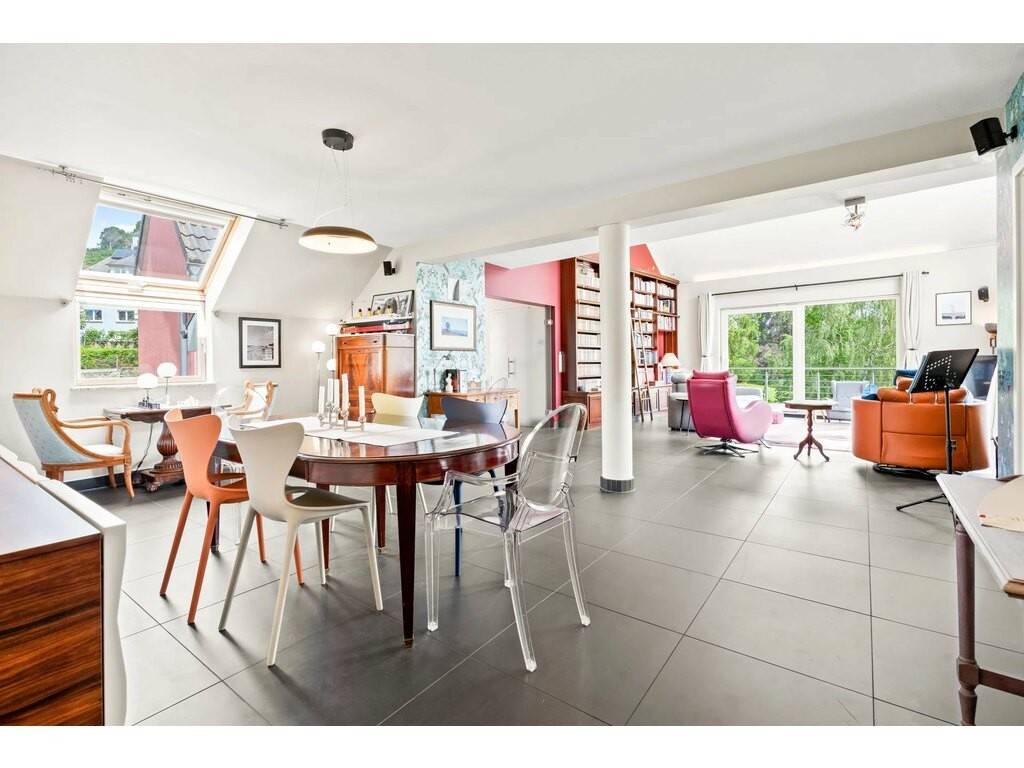 The entrance hall opens onto the living-dining room of ±60 m² with a custom-made library (which can be left in place), a large bay window over the entire height under the roof, access to the ±4,6m² balcony and, above all, a breathtaking view of the Moselle. The same applies to the well-equipped kitchen adjacent to the dining room.