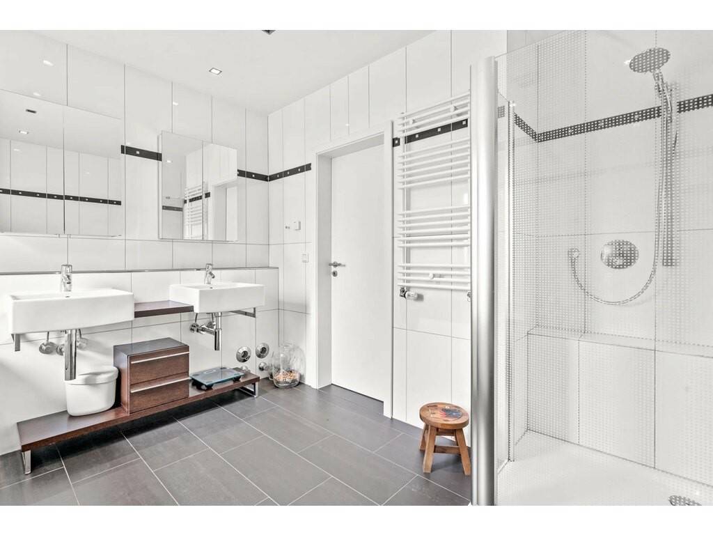 From this generous living space, a night hall leads to 3 large bedrooms (±14,48m²; 18,89m² et 16,36m²), a bathroom and a separate toilet. One of the bedrooms is currently used as a study. The fourth bedroom, in the form of a master suite with a large dressing room and its own bathroom with shower, double washbasin and bath/jacuzzi, is on the other side of the entrance hall, giving access to a terrace (±7,36m²) overlooking the rear of the building.