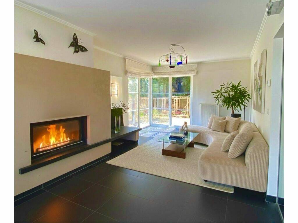 Au rez-de-chaussée, garage pour deux voitures, un espace dressing/vestiaire, une belle cuisine équipée fermée avec accès à une vaste terrasse, salle à manger avec accès direct au jardin, et un agréable salon avec feu ouvert, et un WC séparé.